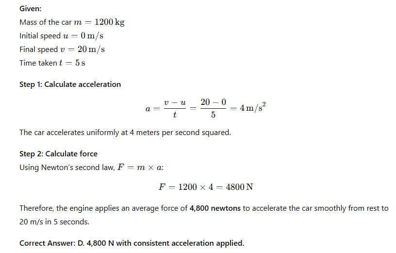 A 1,200 kg car accelerates from rest to 20 m/s in 5 seconds. What is the average force exerted by the engine?