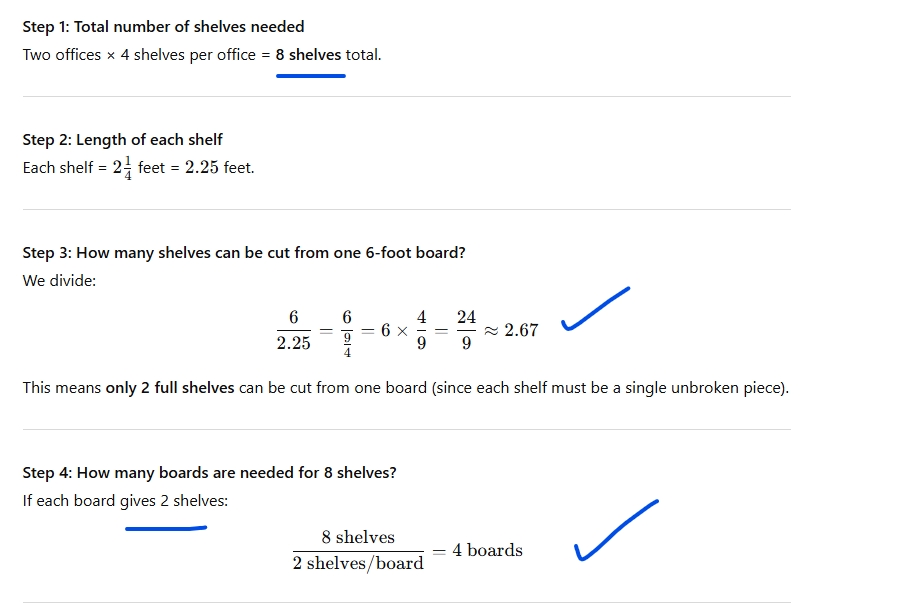 A carpenter needs to fit shelves into two separate offices, installing four shelves in each office. The material of choice is 6-foot-long wooden boards. Each shelf requires a length of 2¼ feet and must be made from a single piece of wood. How many boards should the carpenter purchase to complete the job?