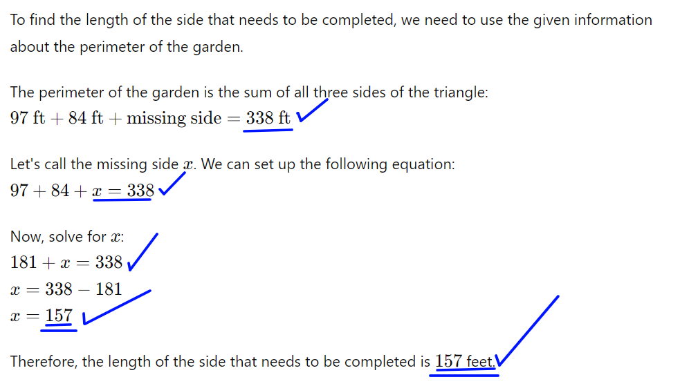 A landscaper has been tasked to complete the fencing of a garden; two sides of the garden have already been fenced. The perimeter of the garden is 338 feet. What is the length of the side that needs to be completed?