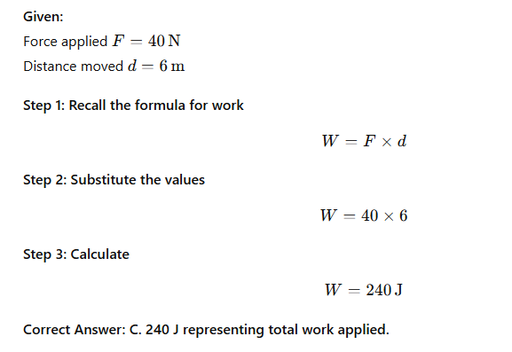 A student pushes a cart with a force of 40 N for 6 meters. How much work is done on the cart?