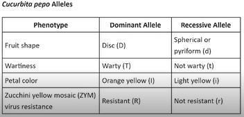 A table of the Cucurbita pepo alleles for four traits is shown.