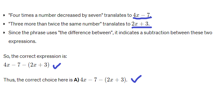 "The difference between four times a number decreased by seven and three more than twice the same number"