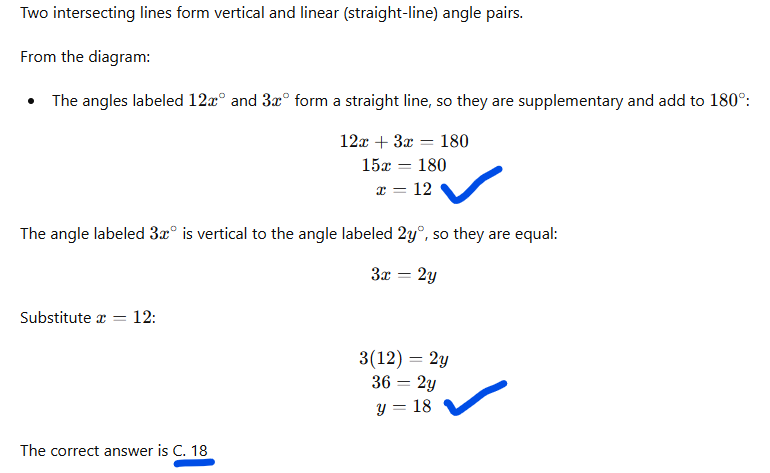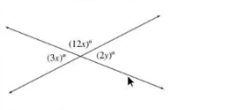 The following diagram illustrates two intersecting lines and three angle measures represented with expressions.