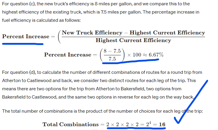 d. Given the map of roads between Atherton, Bakersfield, and Castlewood, if there are two distinct routes between each pair of cities, how many different combinations of routes can the truck take for a round trip from Atherton to Castlewood and back?