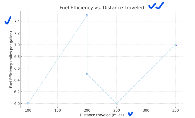 | Trip | Distance traveled (miles) | Fuel Efficiency (miles per gallon) |