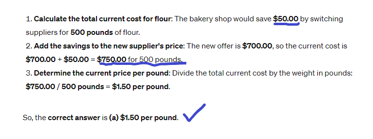 The owner is also negotiating with a supplier for the purchase of flour. A supplier offers 500 pounds of flour for $700.00, which would be a saving of $50.00 compared to what the shop is currently paying for the same quantity.