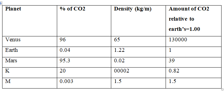 There are varying amounts of carbon IV oxide on the earth’s atmosphere. This gas traps IR energy resulting to increased heat. The table shows the percentage of carbon IV oxide, amount of the gas in each atmosphere relative to the earth and atmospheric densities. Data for 2 hypothetical planets K and M have been included;