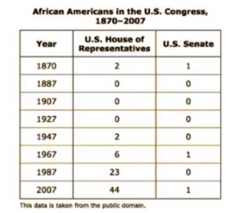 The correct answer is A. This choice aligns with the evidence provided regarding the representation of African Americans in Congress. Despite the passage of civil rights amendments such as the 14th and 15th Amendments, which aimed to secure equal rights and voting protections for African Americans, racial discrimination persisted. The data presented indicates that even decades after the enactment of these amendments, the number of African Americans serving in Congress remained disproportionately low compared to their representation in the population. This disparity suggests ongoing challenges related to racial discrimination and unequal opportunities for African Americans in the political sphere, highlighting the persistence of racial inequities despite legislative efforts to address them.