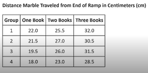 One student from each group released the marble at the top of the ramp, and another student measured the distance the marble traveled on the floor from the end of the ramp. One, two, and three books were used to support the ramp. The data are recorded in the following table.