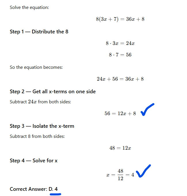 What value of x is the solution to the equation 8(3x + 7) = 36x + 8?