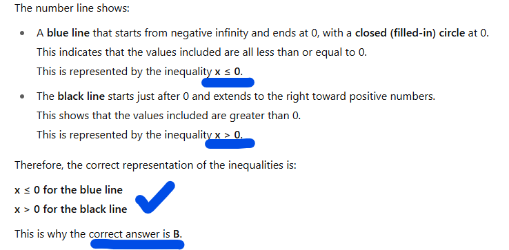 Which of the following choices correctly represent the inequalities depicted by the blue and black lines on the number line?